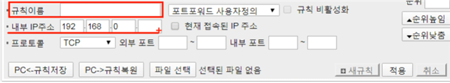관리도구로 접속하여 고급설정 – NAT/라우터 관리 – 포트포워드 설정
