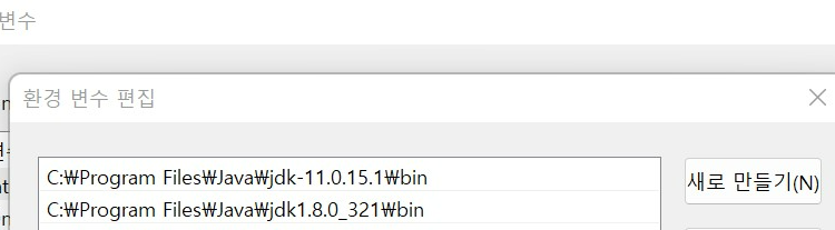 나의 경우 jdk 8과 11을 번갈아 사용하기 때문에 환경 변수에서 두 경로를 모두 추가 후