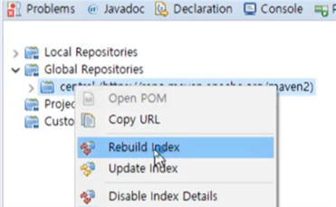 Global Repositories > central 우클릭 > rebuild index를 눌러 인덱싱을 해야한다
